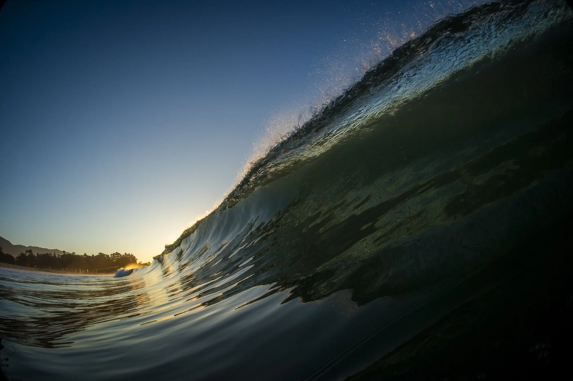 View inside a breaking wave at sunset, showing the shoreline and trees in the distance.